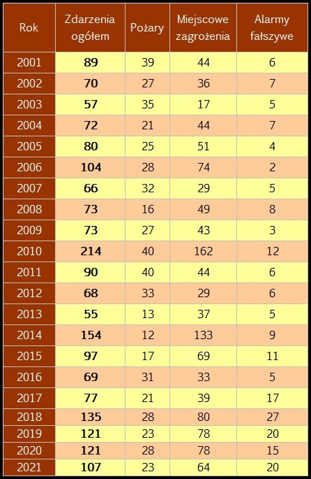 Statystyka interwencji podejmowanych przez OSP Szczawnica w latach 2001 - 2021: